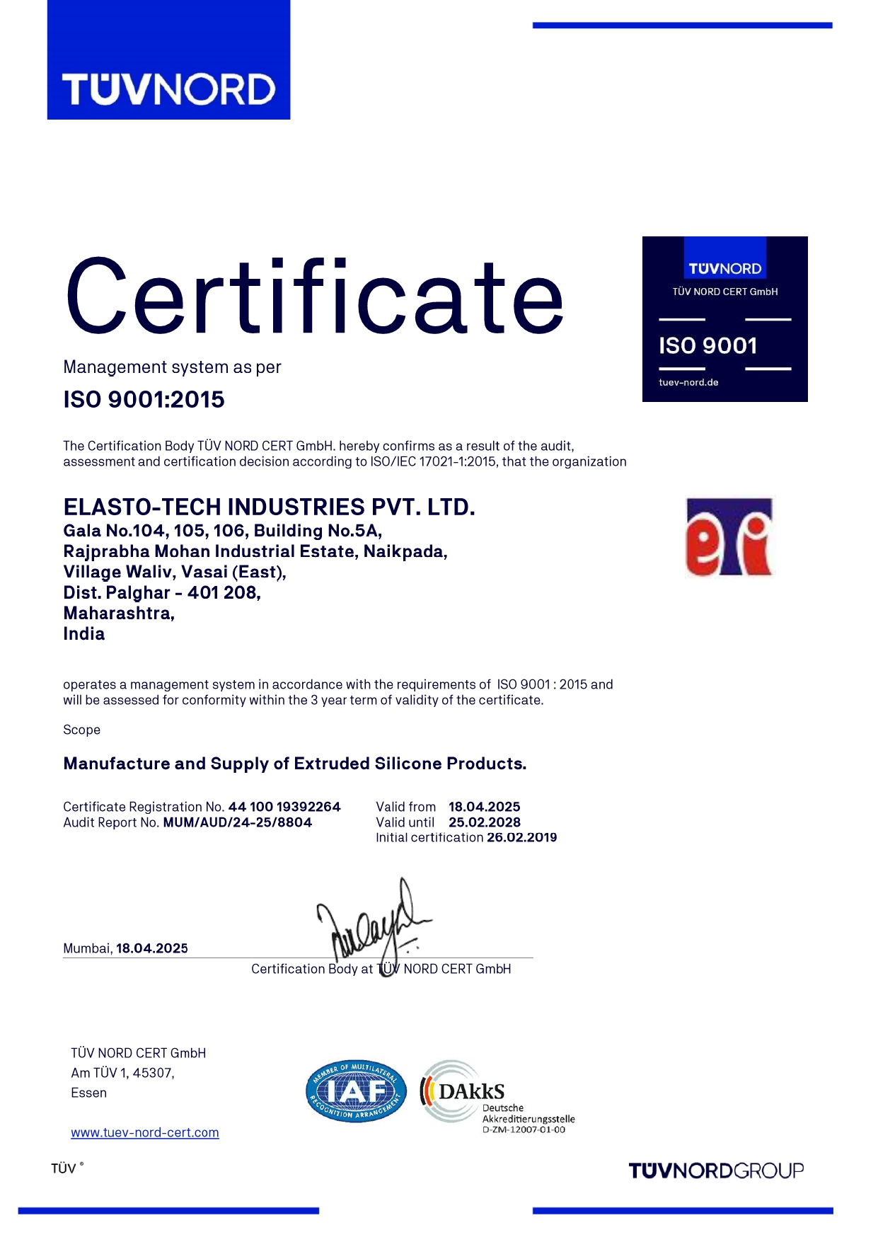 - ISO 9001-2015 Certified Company, Registration No.44 100 19392264 (TUV-NORD, Germany)