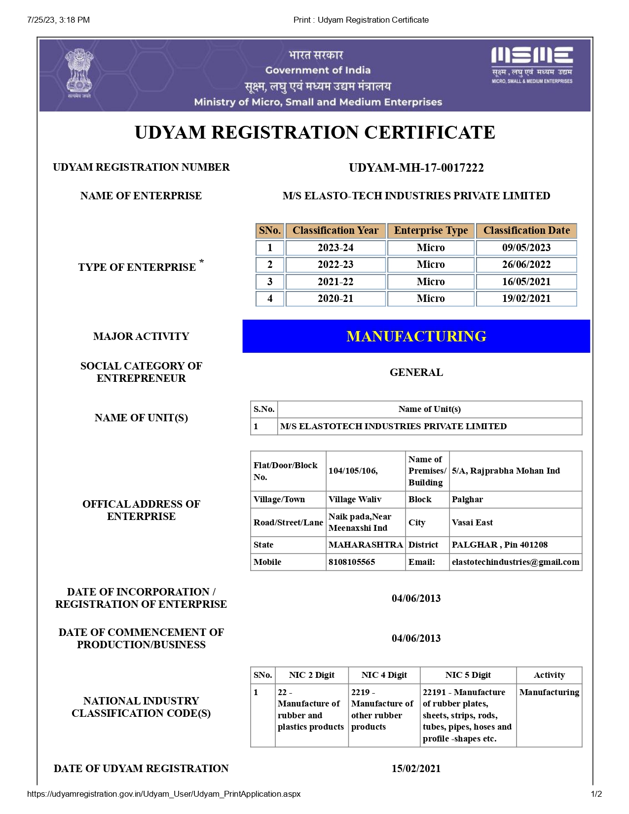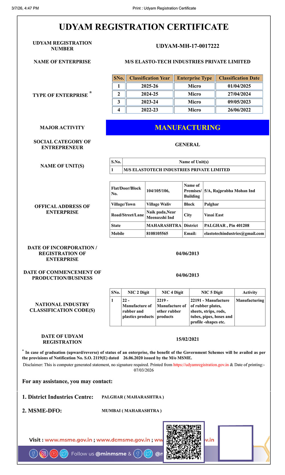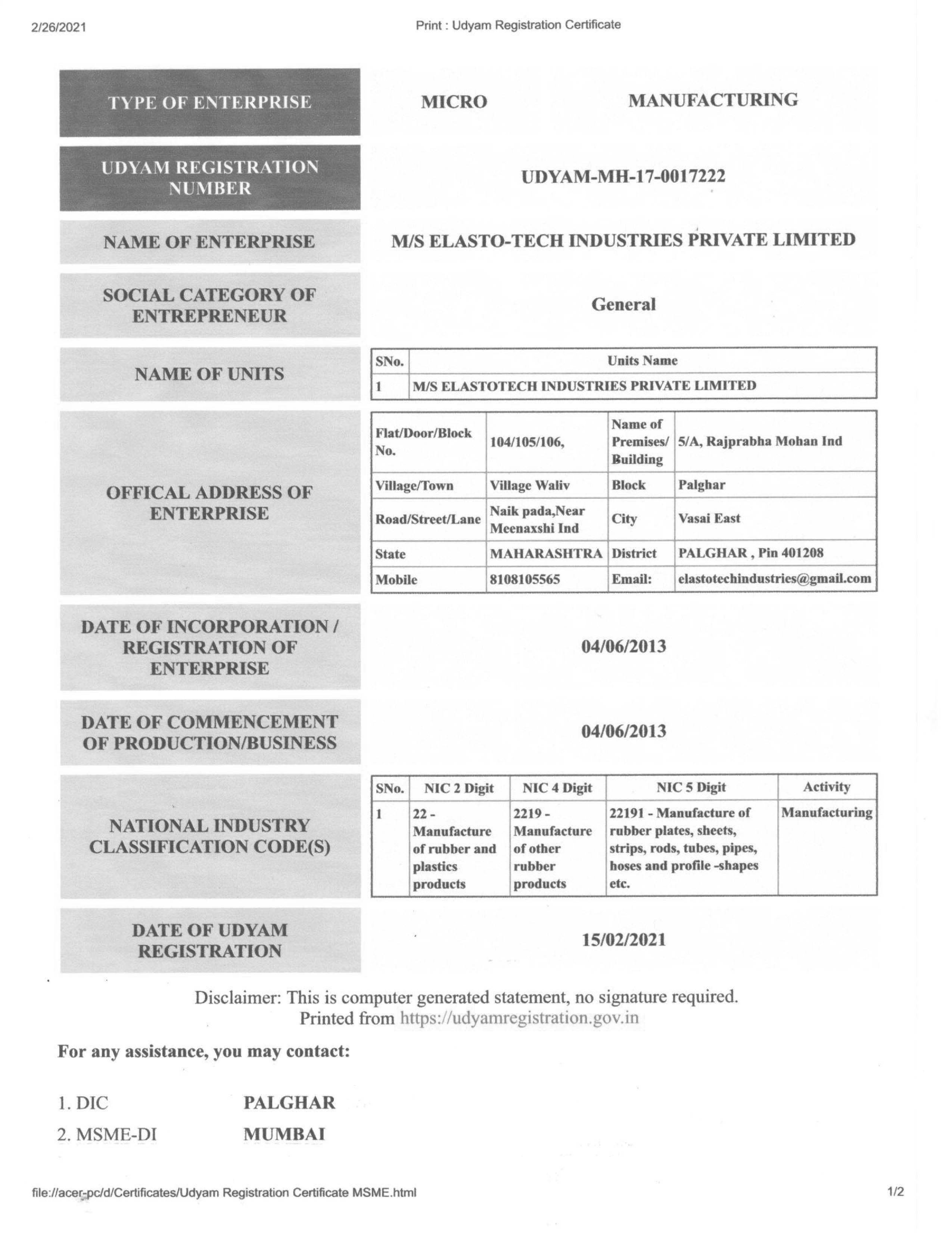 - MSME Reg. no. UDYAM-MH-17-0017222